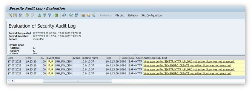 Dateitransfers in SAP-Anwendungen sind in der Vergangenheit oft ohne Wissen der Sicherheitsverantwortlichen implementiert worden. Aktuelle ABAP-Kernel (ab Release 757) erzeugen daher Warnungen (SAL Event FU9) im Security Audit Log, wenn Dateien transferiert wurden, die aufgrund fehlenden oder nicht aktiviertem VSI-Virenschutz nicht gescannt wurden. Solche Warnungen werden bei einer Prüfung in der Regel als Business-Risiko gewertet und eine Mitigation muss nachgewiesen werden.
