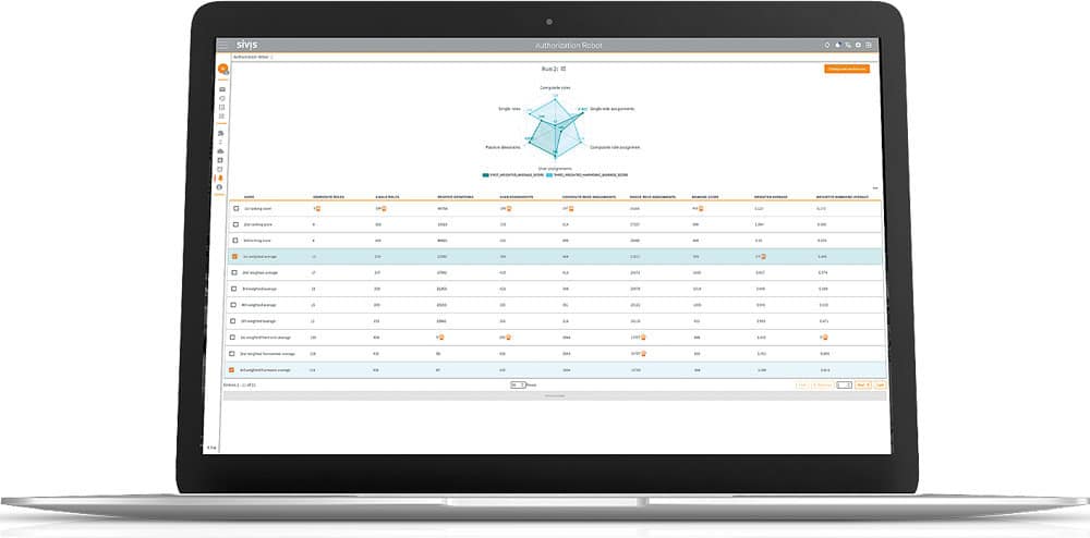 Auch individuelle Ziele oder Prioritäten können vorgegeben werden und fließen in die Berechnungen ein, abgestimmt auf Parameter wie „Lizenzkosten-Optimierung“ oder „Maximales Sicherheitslevel“. Die Nutzeroberfläche des virtuellen Rollenberaters visualisiert bereits während des Rechenprozesses die Entwicklung der verschiedenen Kennzahlen in Echtzeit auf dem Dashboard. Die verwendeten Webtechnologien ermöglichen verschiedenste intuitiv erfassbare Visualisierungsformen wie Graph-Views, Sunburst-Grafiken oder Tree-Maps. Komplexe Zusammenhänge und Muster werden strukturiert vermittelt, vom kompakten Gesamtüberblick bis hin zu granularen Details.