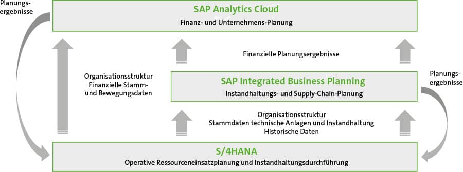 Allein mit Excel lässt sich jedoch eine integrierte Instandhaltungsplanung nicht realisieren. Stattdessen sollten dezidierte und integrierte Anwendungen zum Einsatz kommen. Dabei geht es zum einen um die Systeme, in denen die erforderlichen Stammdaten (beispielsweise Equipments, Wartungspläne und Arbeitspläne) und transaktionalen Daten (zum Beispiel Aufträge und Rückmeldungen) vorgehalten werden. In einem SAP-Umfeld ist das im Wesentlichen S/4 (oder ERP/ECC 6.0).