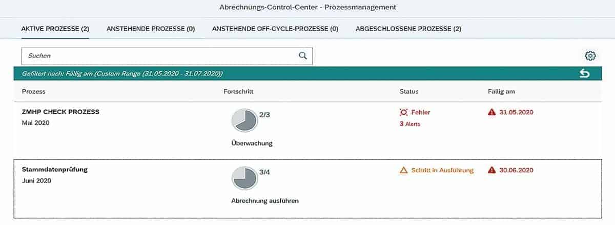Abbildung 1 stellt die Prozessmanagement-Sicht des Payroll Process Managers dar mit allen aktiven, anstehenden und abgeschlossenen Prozessen. Der Payroll Process Manager hat so alle Prozessstatus, -fortschritte und Fälligkeitsdaten im Blick. Innerhalb eines Prozesses kann er die einzelnen Prozessschritte ausführen, wie beispielsweise den Vorabrechnungsprozess in Abbildung 3. Unterhalb des Prozessstatus erscheint die aktuelle Anzahl an Alerts, die sich in der Sicht Alert-Management anzeigen und beheben lassen. Bei einer Vielzahl an Prozessen besteht darüber hinaus die Möglichkeit, diese zur besseren Übersichtlichkeit zu filtern.