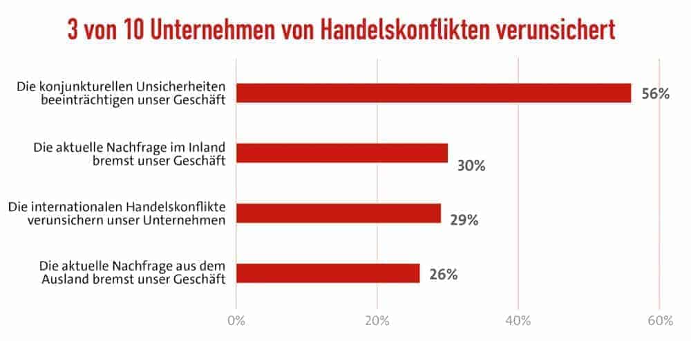 Fast jedes dritte Unternehmen fühlt sich zudem explizit von den internationalen Handelskonflikten verunsichert. Und 26 Prozent konstatieren, dass die aktuelle Nachfrage aus dem Ausland ihr eigenes Geschäft bremst.