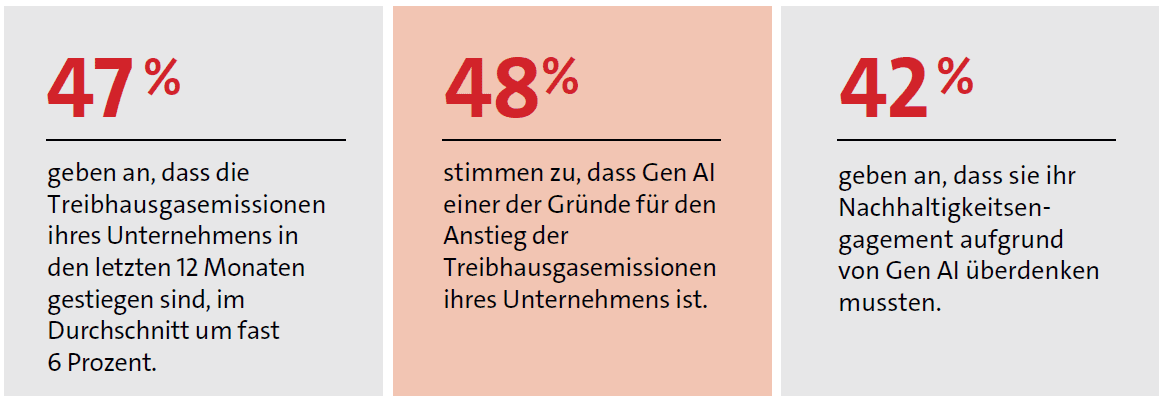 Während sich innovative Gen-AI-Lösungen schnell verbreiten, haben Organisationen bei der Erfassung des ökologischen Fußabdrucks der Technologie nicht Schritt halten können: Zwölf Prozent der Führungskräfte, die Gen AI einsetzen, geben an, dass ihre Organisation den entsprechenden ökologischen Fußabdruck erfasst, und nur 38 Prozent sind sich grundsätzlich der Auswirkungen der Technologie auf die Umwelt bewusst.