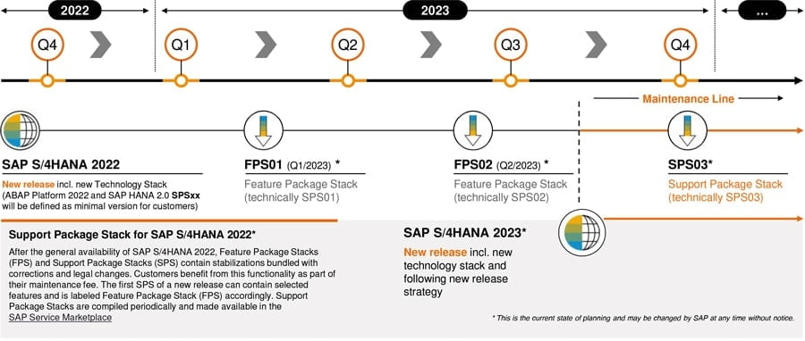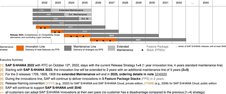 Seit 2015 wurden bereits acht S/4-Releases herausgegeben. Das nächste wird S/4-Release 2023 sein, ab dem es zukünftig alle zwei Jahre eine neue S/4-Hana-Version für On-premises geben wird. Die Mainstream Maintenance eines Releases besteht dann aus zwei Phasen: der Innovation Line, wo neue Funktionalitäten über die Feature Package Stacks (FPS) bereitgestellt werden, sowie der darauffolgenden Maintenance Line, bei der Änderungen über Support Package Stacks (SPS) verfügbar sind. Auf dem Innovationstrack bleibt man somit nur bei regelmäßigen Updates alle zwei Jahre.