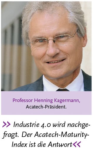 Unternehmen suchen nun ihre individuelle Umsetzungsstrategie. Unser Industrie-4.0-Maturity-Index gibt ihnen dafür neutrale, frei verfügbare Analyseinstrumente an die Hand. Mit dem Industrie-4.0-Maturity-Center entsteht eine Anlaufstelle für alle, die diesen Leitfaden nutzen wollen“