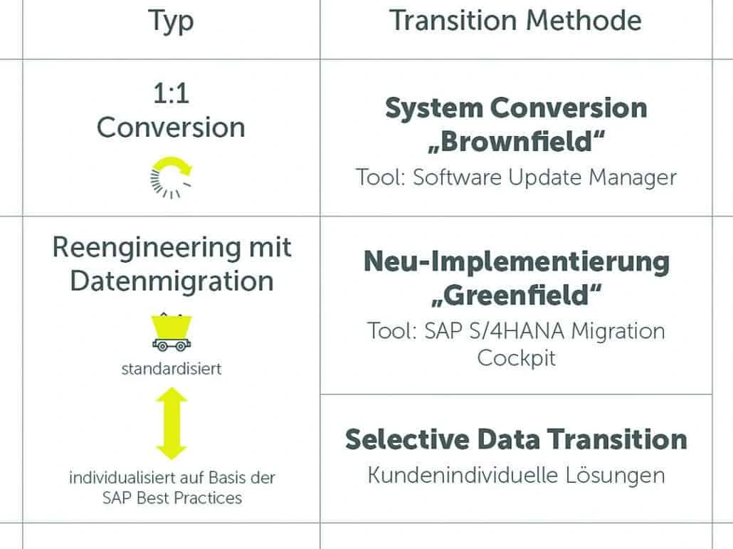 Stehen Sie am Beginn Ihrer Überlegungen, so können wir Sie mit unserem „Roadmap“-Ansatz in der Findung der passenden Conversion-Methode unterstützen. Wir betrachten dabei gemeinsam mit Ihrem Team den Zustand Ihrer aktuellen Systemlandschaft, zeigen die neuen Möglichkeiten im S/4HANA auf und diskutieren mit Ihnen die Auswirkungen, die sich daraus für Sie ergeben.