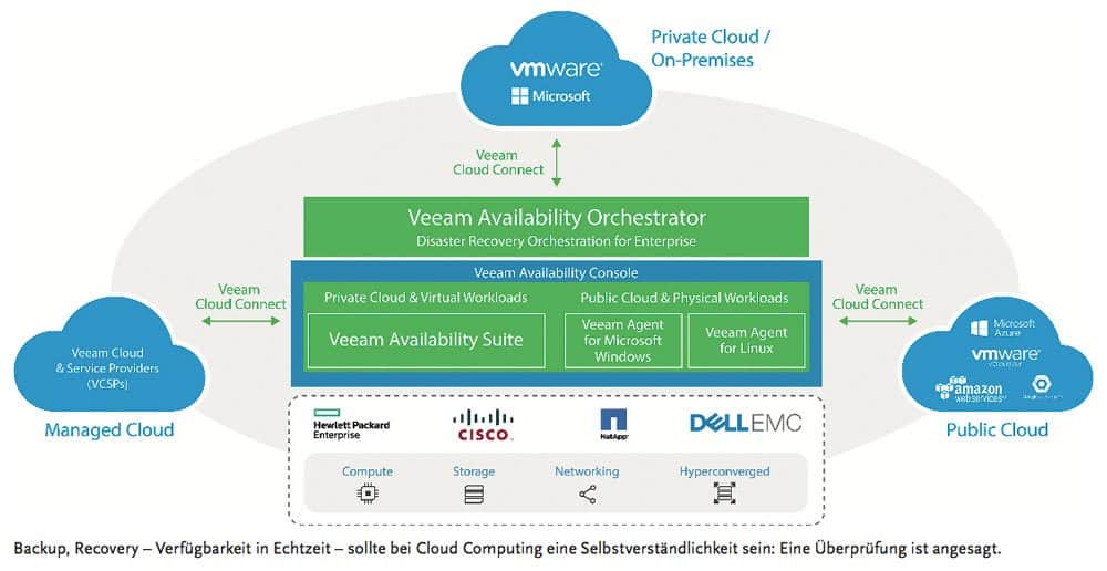 Integriert in eine Plattform können diese Datensicherungsmechanismen zentral gesteuert und überwacht werden. Die Veeam Availability Platform for the Hybrid Cloud umfasst eine Vielzahl an Komponenten, die es Unternehmen ermöglichen, die Verfügbarkeit virtueller, physischer und cloudbasierter Workloads in einer Hybrid-Cloud-Umgebung einfach und kosteneffizient zu organisieren und sicherzustellen.
