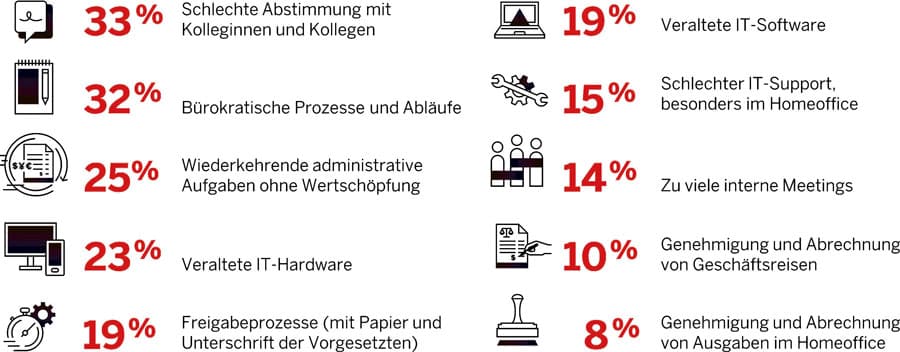 For those surveyed in 2022, the greatest potential for frustration was poor coordination with colleagues (33 percent). One reason for this is the choice of communication tools: Even if digital collaboration tools support communication, personal contact on site cannot always be digitized in daily coordination. For example, 55 percent of respondents say that digitization and virtual meetings can maintain business relationships remotely, but they do not replace business trips and the associated face-to-face exchanges. SMEs have already readjusted their IT hardware and software: While 23 percent still felt thwarted by IT hardware in 2022, this figure was 32 percent the year before. SMEs have also taken a leap forward when it comes to updating IT software.