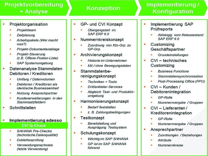 The combination of the Adesso Active Transformation process model for the business partner conversion and the CVI Q-Check tool provides all the content needed to optimally prepare an ECC system for the S/4 conversion with clean master data and the necessary activities.