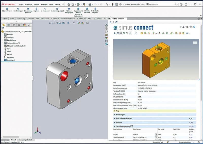 Separate silos of technical and commercial information and procurement prices leave developers in many companies in the dark about the follow-up costs of their projects. Yet up to 80 percent of manufacturing costs are already determined during product development. Often, minor changes in geometry, material or tolerances would generate significant savings! With simus connect, designers can now automatically calculate the expected manufacturing costs of their components and assemblies directly from the user interface of their 3D CAD system and display the calculation results. Without making any changes to the CAD model, costs for different tolerances, materials or surface treatments can be determined. The most expensive machining operations are tracked down and displayed in color at the touch of a button. This means that cost drivers can be identified during the development phase and effective countermeasures can be taken. Easy to use without interrupting work, the automatic calculation triggers knowledge gains, creates calculation knowledge and strengthens the cost awareness of the designers.