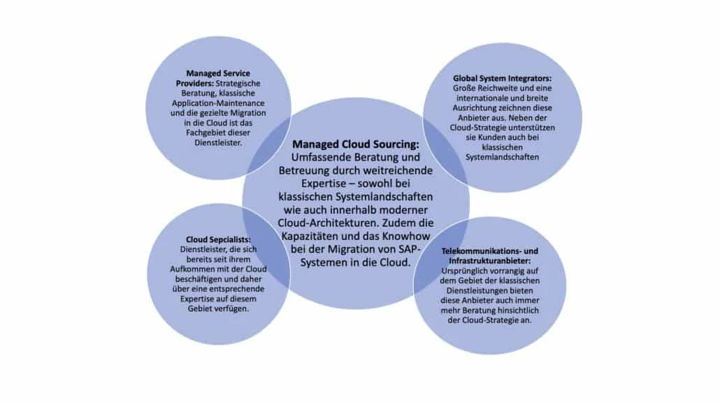 Especially for companies at the beginning of their cloud journey, the range of cloud services and possible strategies is often confusing. The decision to rely on the expertise of different specialists on the market is therefore obvious - especially for IT systems such as SAP, which require a strategy tailored precisely to them. Managed cloud sourcing allows the decisive advantages of the individual specialists in the cloud market to be optimally combined.