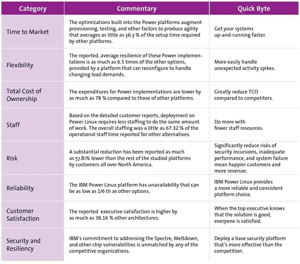 IBM’s virtualization is a product of the mainframe era (who still remembers MVS?). Because of that, the additional latency losses typical for third-party virtualizations can be avoided. For Hana, this results in bare metal performance. Memory and CPU performance can be tailored to customer needs in increments of 1 MB and 1/20 cores.