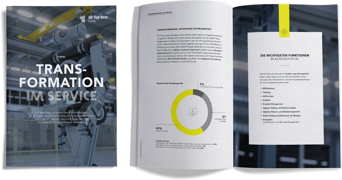 Get the e-book "Transformation in Service: on the Way to New Business Models". The free guide explains the background and shows possible solutions. Read how you can create the data basis with IoT, design a holistic customer experience with a smart customer and service portal, and establish digital end-to-end processes in service step by step.
