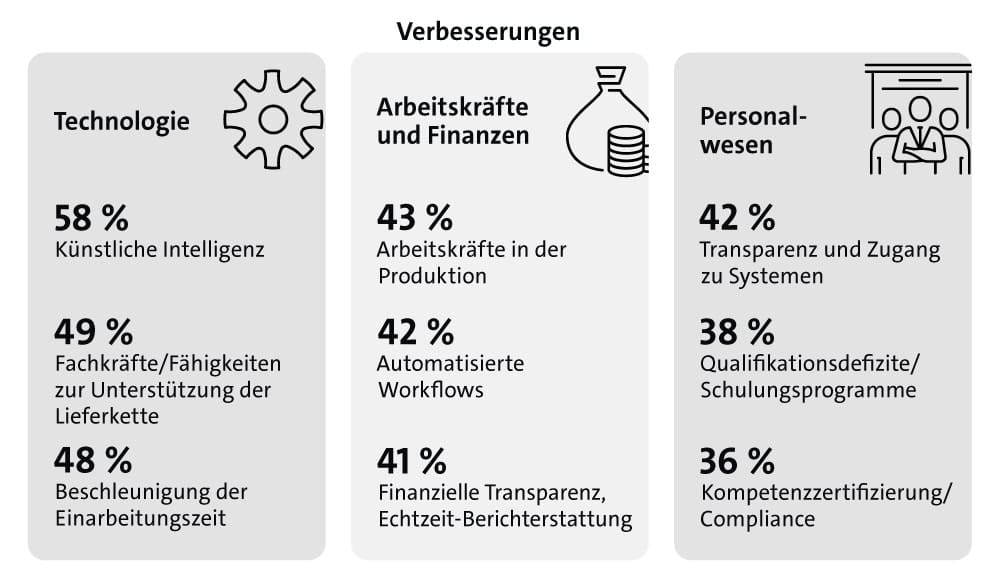 30 percent of German companies speak of inefficient and manual information flows, which leads to delayed decisions and a lack of transparency. German companies could significantly speed up their decision-making processes by improving data quality and introducing real-time analyses. Overall, 58 percent of companies are planning to improve or replace their ERP systems with AI-supported solutions.