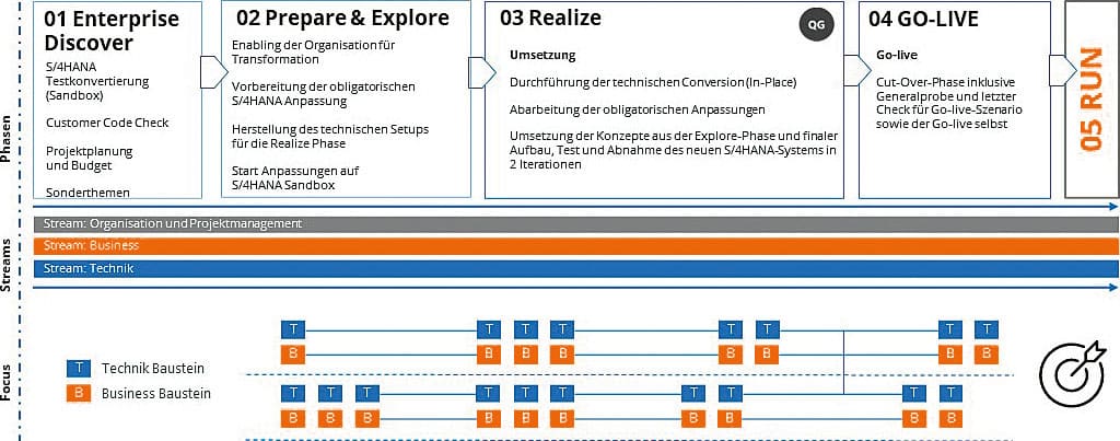 This gives companies the option of converting the new processes only at a later point in time after the S/4 conversion at their leisure until the end of 2027, if this is necessary. This means that the project scope and budget for the actual S/4 transformation can be reduced to what is necessary, and the project duration can also be significantly shortened as a result.