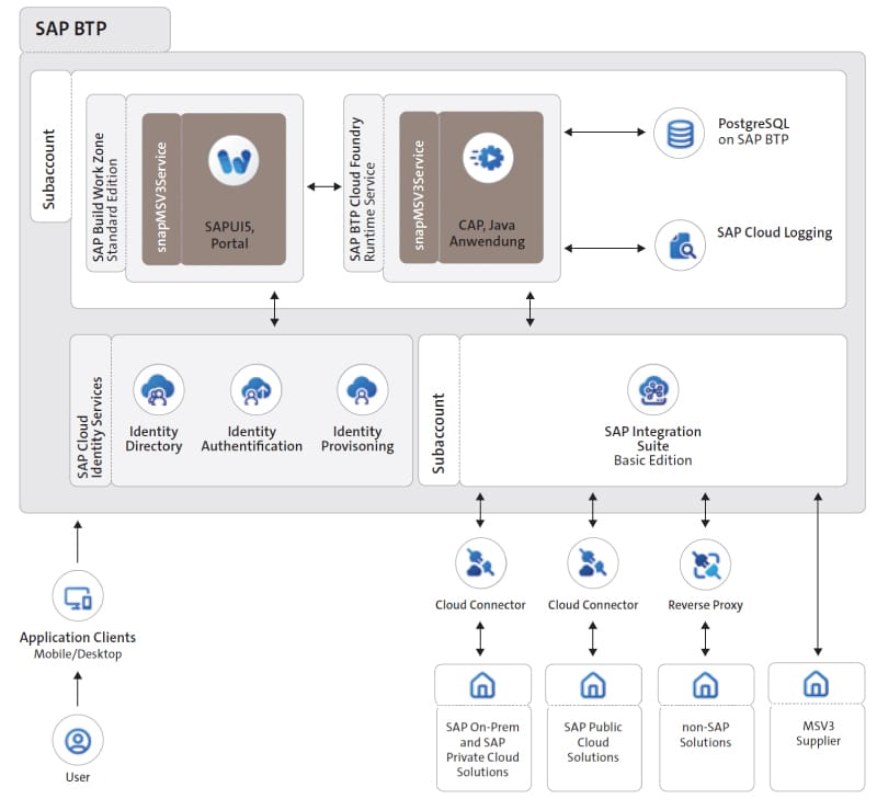 The previously defined "cloud capability" of our solution is based on the fact that it is a process that can be easily separated (from the SAP core) and integrated with the SAP core. This process comprises three levels or systems: the SAP backend, the portal itself - i.e. the snapMSV3service application - and the MSV3 supplier side. The core component for communication between these three levels is SAP Cloud Integration (SAP CI), which establishes the secure connection between the local customer network (for on-prem) or the customer's S/4 Hana cloud instance and our SAP BTP instance via SAP Cloud Connector. Requirements are generated in the SAP backend of customer X and transmitted to the portal. There, a portal user of the customer processes these requirements - he performs availability checks against the MSV3 suppliers and responds to their feedback. The ordering process then begins with a significant special feature: a corresponding order number must be generated in SAP before an order is actually placed with the MSV3 supplier so that this can be entered as a reference in the MSV3 order.