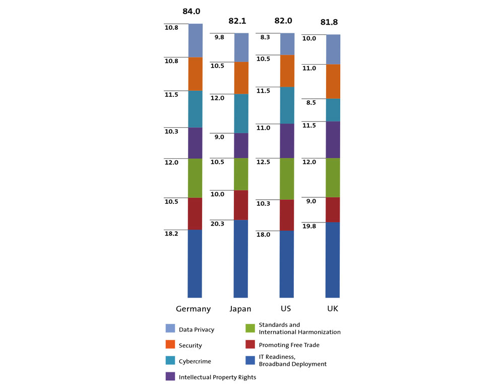 In particular, the areas of data protection, cybersecurity legislation and broadband infrastructure received even greater attention. Germany is followed by Japan and the USA by a small margin.