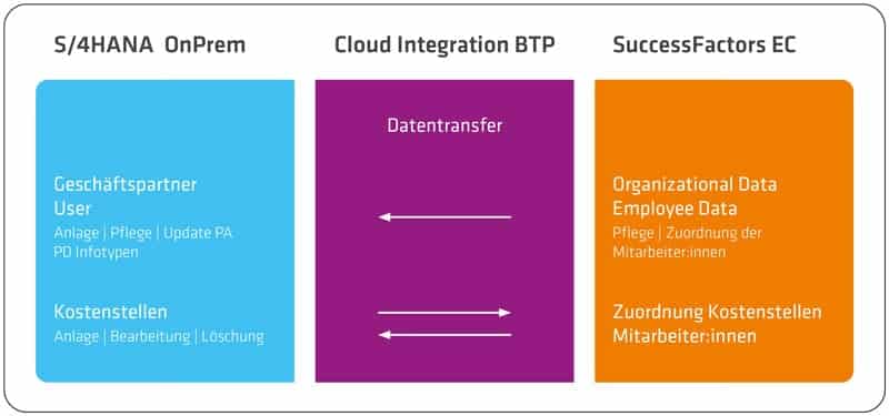 Los datos maestros de los empleados y los datos de la empresa se replican en el sistema S/4HANA a los infotipos correspondientes en Administración de Personal y Gestión Organizativa. Los datos se recuperan a través de la API de empleado compuesto en SuccessFactors. El mapeo de los campos o las asignaciones a través de complementos empresariales se realizaron previamente en la integración en la nube, así como en el sistema S4/HANA OnPrem a través del Business Integration Builder. La configuración para la integración de centros de coste se realiza a través de la Integración de Datos Maestros SAP ERP CO con SuccessFactors Employee Central a través de la IMG (SAP-Implementation GUIDE).