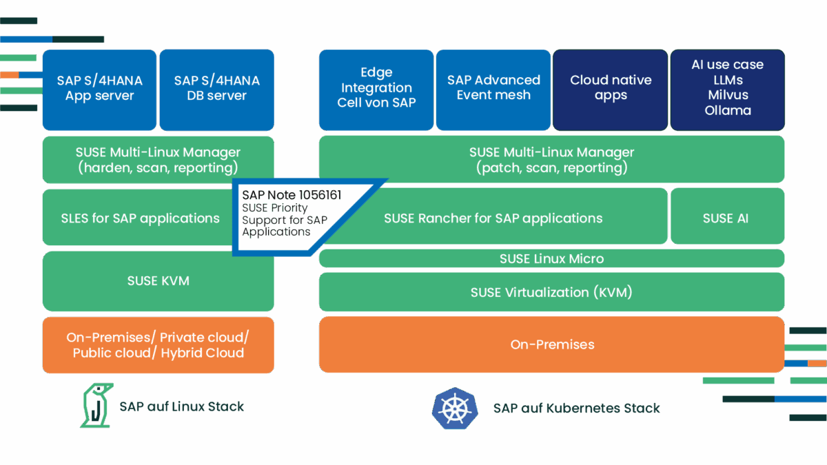 Los entornos SAP se mueven cada vez más entre dos mundos tecnológicos. Por un lado, existen sistemas ERP y bases de datos altamente personalizados que tradicionalmente se ejecutan en infraestructuras virtualizadas basadas en Linux. Por otro lado, las aplicaciones en contenedores están ganando importancia, por ejemplo, las extensiones de SAP Business Technology Platform o los servicios relacionados con los bordes, como SAP Edge Integration Cell. En el futuro, muchas empresas combinarán ambas cosas: cargas de trabajo establecidas en las instalaciones y servicios flexibles nativos de la nube. Este funcionamiento híbrido requiere plataformas que admitan ambos mundos. Aquí es precisamente donde entra SUSE como socio tecnológico de SAP desde hace mucho tiempo, con una completa cartera de soluciones para la pila clásica de SAP y las arquitecturas modernas de Kubernetes.