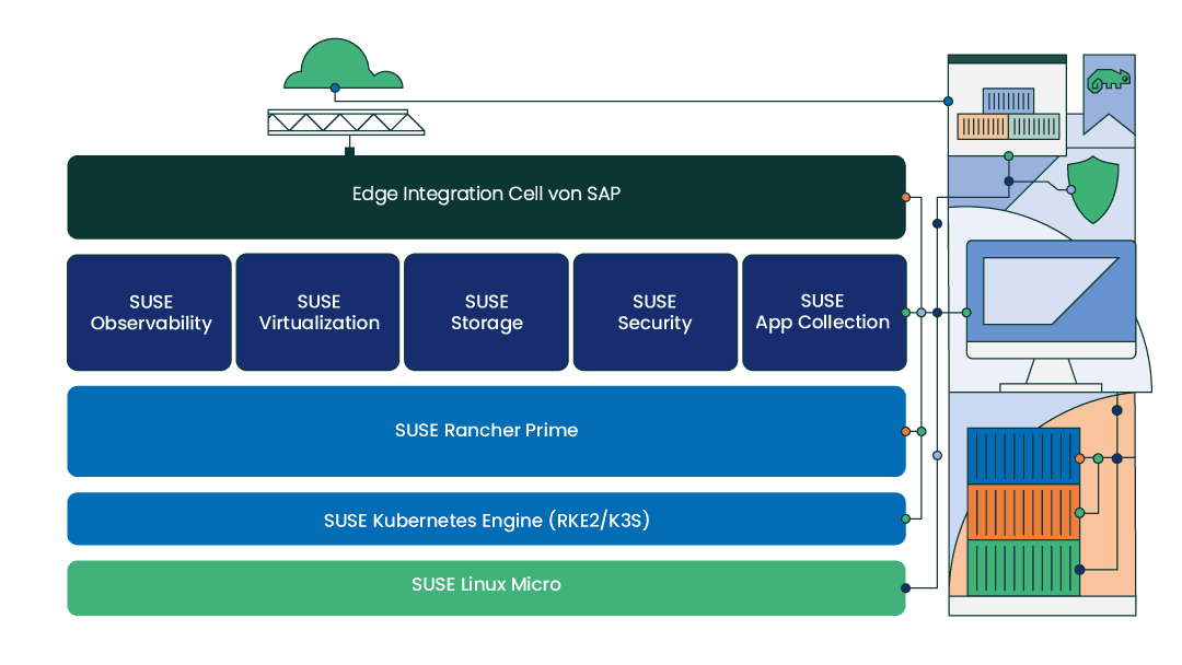 Para los componentes SAP en contenedores, como Edge Integration Cell, SUSE ofrece ahora SUSE Rancher para aplicaciones SAP, una plataforma Kubernetes especialmente adaptada a los requisitos de estas aplicaciones. Combina una pila de Kubernetes validada con las mejores prácticas para un funcionamiento productivo. La solución se complementa con SUSE Linux Micro como plataforma de tiempo de ejecución optimizada, así como con soluciones de seguridad, observabilidad y virtualización. Ambas pilas tecnológicas pueden combinarse en escenarios híbridos, sin estar atadas a una infraestructura específica.