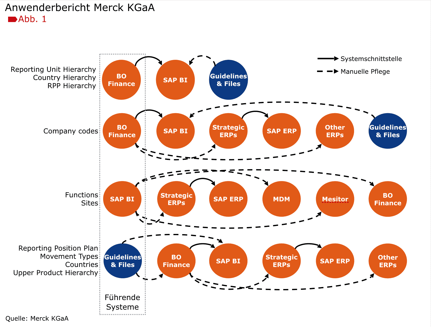 Para el Datos de referencia (Informes Jerarquía de Unidades, Jerarquía de Países, Funciones, Jerarquía Superior de Productos, etc.) existían diferentes "sistemas líderes". A partir de estos sistemas principales, el Datos distribuidos a varios subsistemas.
