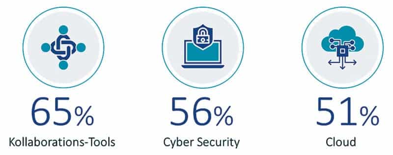 A pesar de estas aleccionadoras cifras, el 66% de las empresas mantiene su presupuesto para transformación digital, y otro 25% incluso lo aumenta. Este es el resultado de una encuesta realizada por Tata Consultancy Services (TCS). En concreto, las empresas están invirtiendo más en tecnologías que permitan trabajar desde casa. Entre ellas se encuentran las herramientas de colaboración (65%), la ciberseguridad (56%) y la nube (51%).