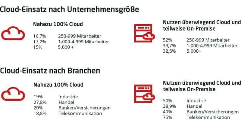 El grado de adopción de la nube por parte de las empresas depende tanto del sector como del tamaño. Las empresas de hasta 999 empleados utilizan la nube predominantemente o casi el 100 por cien de las veces. Esto las sitúa muy por delante de las empresas de 1000 a 4999 empleados, el 56,9 por ciento de las cuales utilizan la nube predominantemente o casi por completo.