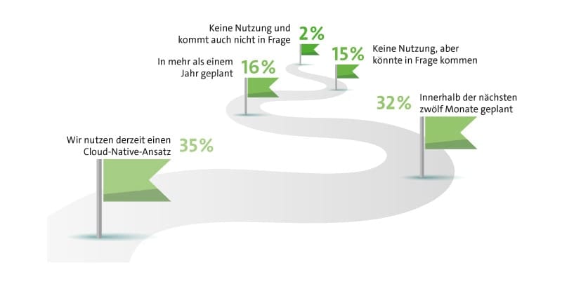 Al igual que el año pasado (tres por ciento), este año sólo el dos por ciento descarta un enfoque nativo de la nube. Esto demuestra la importancia de una forma de trabajar totalmente orientada a la nube para permitir un uso más eficiente de la misma. Todavía parece haber una falta de implementación. En la actualidad, un tercio de las empresas declaran estar trabajando en la nube (35%) o tienen previsto hacerlo en los próximos doce meses (32%). El año pasado, casi la mitad de las empresas (45%) trabajaba con la nube de este modo y sólo una cuarta parte (26%) tenía previsto implantarla en el plazo de un año.