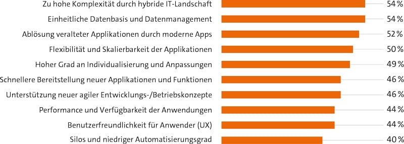Con este telón de fondo, las empresas tendrán que superar una amplia gama de retos en el futuro, por lo que no es de extrañar que los más importantes sean el cumplimiento de los marcos presupuestarios puestos a su disposición, los plazos limitados, tanto para la eliminación de errores como para toda la duración del proyecto, una elevada experiencia de usuario, ciclos de lanzamiento cortos para una rápida salida al mercado, así como la cooperación entre los departamentos especializados y los de TI.