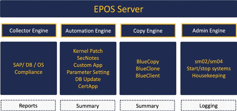 Por defecto, este servidor (o una VM) es proporcionado por el cliente según las especificaciones del proveedor de la suite de automatización SAP Basis. Se trata de un servidor Linux o Windows. Contiene un Collector Engine (recopilación de datos; para informes), un Automation Engine (para las funciones de automatización propiamente dichas), un Copy Engine (para crear copias del sistema y de los clientes) y un Admin Engine (por ejemplo, para el mantenimiento). Para que la suite de automatización SAP Basis pueda funcionar favorablemente, se necesitan datos o información de y sobre los sistemas y componentes SAP utilizados. La suite recopila estos datos o información de los sistemas SAP, por así decirlo.