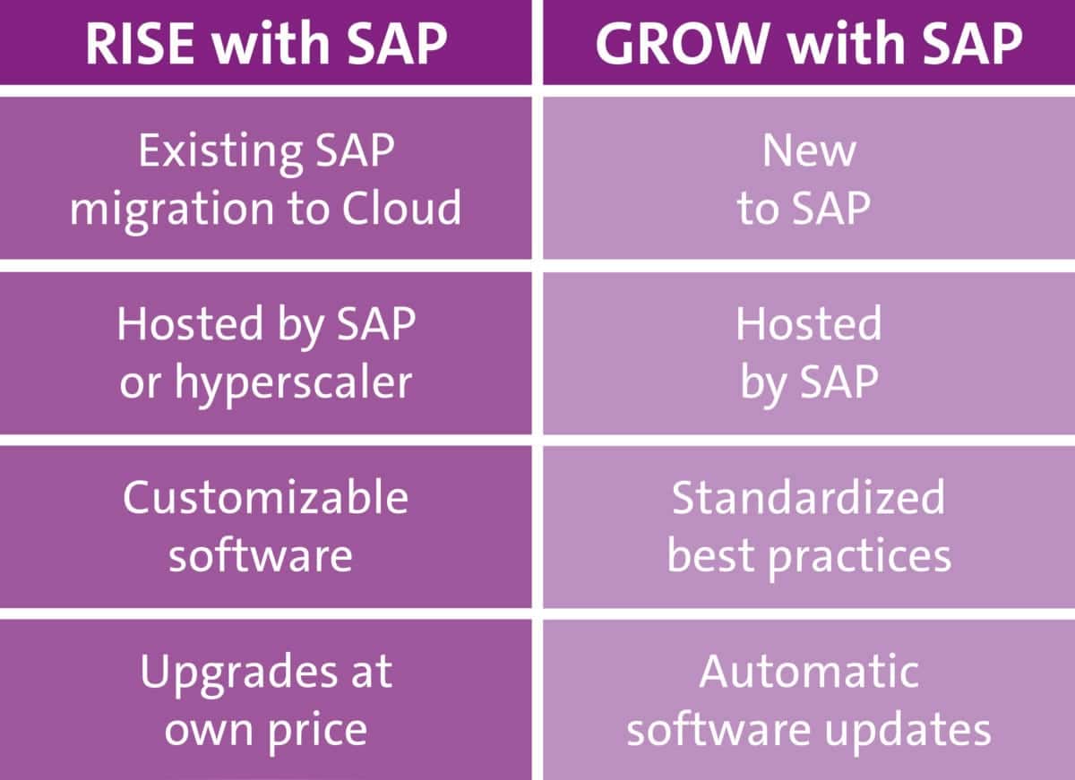 SAP poursuit actuellement deux voies stratégiques dans le domaine du cloud : Grow with SAP et Rise with SAP. Les deux s'adressent à des groupes de clients et à des situations de départ différents - mais visent le même objectif : la transformation en un ERP cloud standardisé et pérenne.