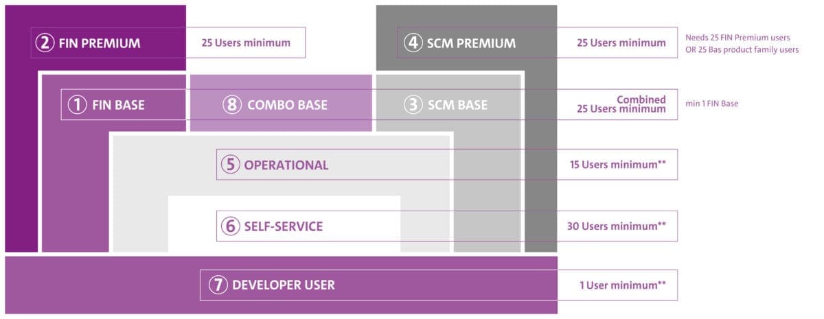 SAP définit aujourd'hui des groupes d'utilisateurs clairement délimités : par exemple les "Operational Users", qui exécutent des tâches opérationnelles telles que les processus de commande et de service, ou les "Self-Service Users", qui ont des droits limités pour des fonctions telles que la saisie des temps ou les demandes d'achat. Les Developer Users disposent d'un accès complet aux fonctions de développement et de personnalisation, tandis que les Combo Users combinent à la fois des fonctions financières et des fonctions de la chaîne logistique. Parallèlement, SAP a introduit de nouvelles quantités minimales d'utilisateurs. Alors que dans l'ancien modèle FUE du Public Cloud, 15 Full User Equivalents suffisaient, le nouveau modèle de licence exige désormais au moins 25 utilisateurs en cas d'utilisation de paquets de base combinés. Pour les petites organisations en particulier, cela peut entraîner des surplus de licences et donc des obstacles plus importants à l'entrée.