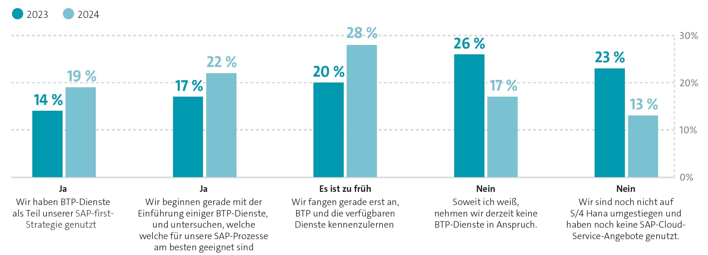Comme de plus en plus d'entreprises passent à S/4, l'intérêt pour la Business Technology Platform augmente également. BTP est un élément important des efforts de SAP pour simplifier S/4 et éliminer de nombreux défis d'héritage associés à SAP ECC - mot-clé Clean Core. Le rapport de recherche montre qu'avec l'adoption croissante de S/4, l'utilisation de BTP continue d'augmenter.