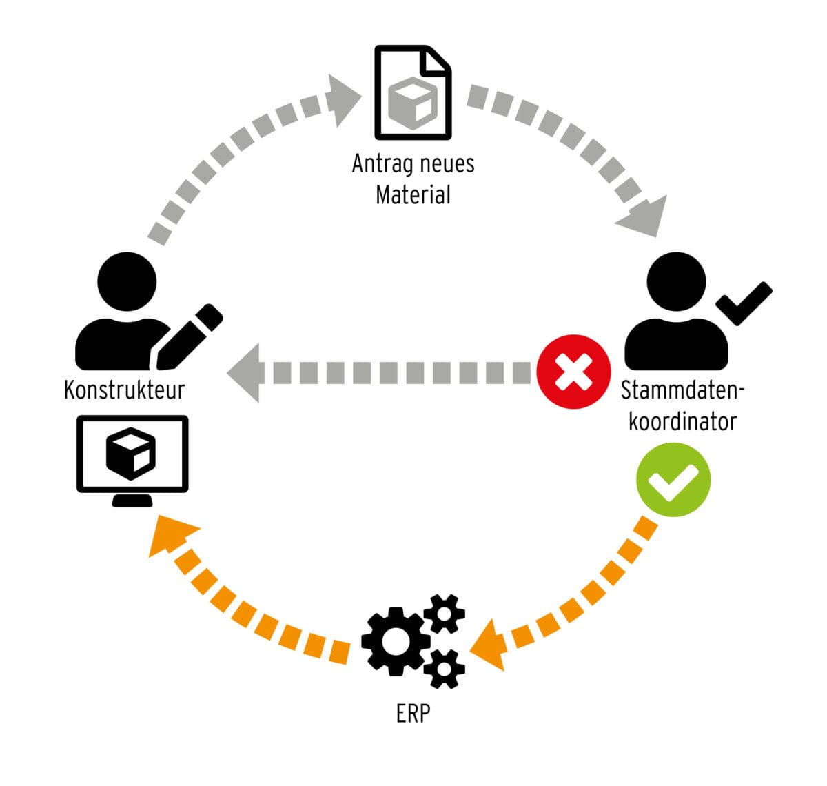 Afin de maintenir la qualité des données de base une fois qu'elle a été atteinte, classmate FINDER transforme les règles de la gouvernance des données de base en processus. Ainsi, les utilisateurs peuvent par exemple faire une demande de matériel s'ils ne trouvent pas la pièce souhaitée. Un centre de données de base évalue les demandes de matériel. Après une décision positive, le nouvel article est automatiquement créé dans SAP S4/HANA via l'interface.